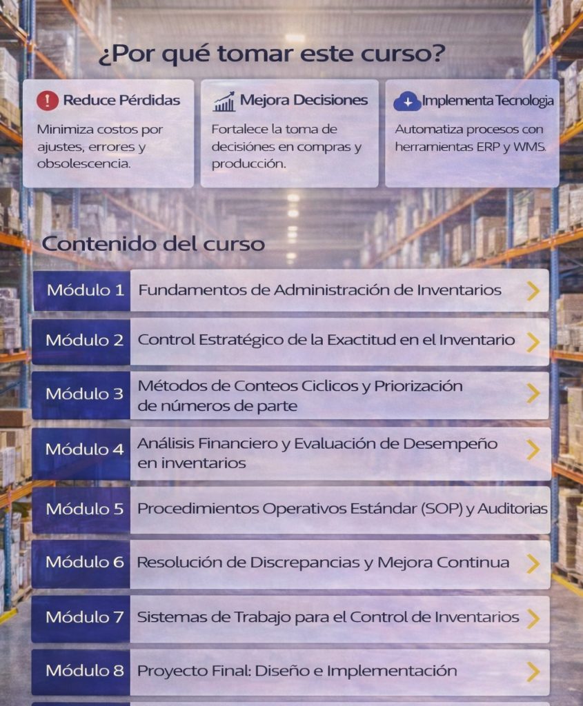 Acompañamiento en la implementación: no solo damos el curso; apoyamos a tu equipo a asegurar mejoras visibles en exactitud, flujo y disponibilidad.