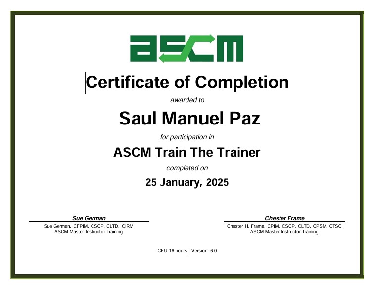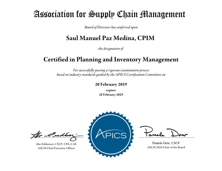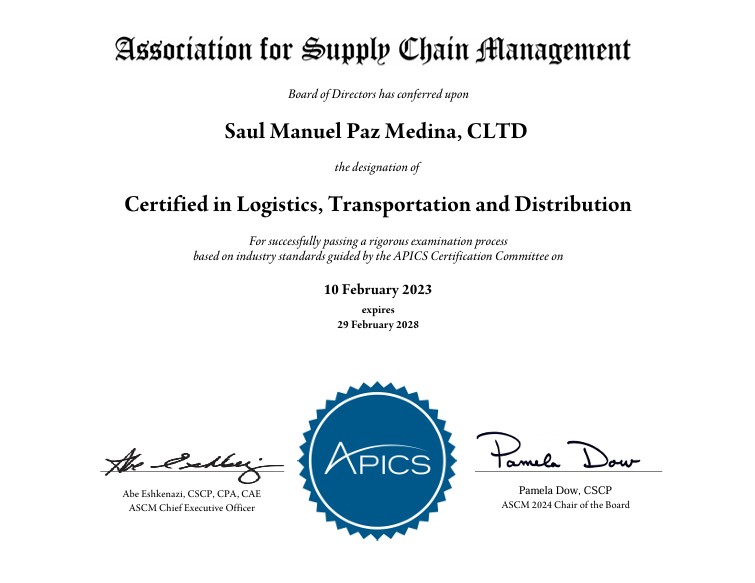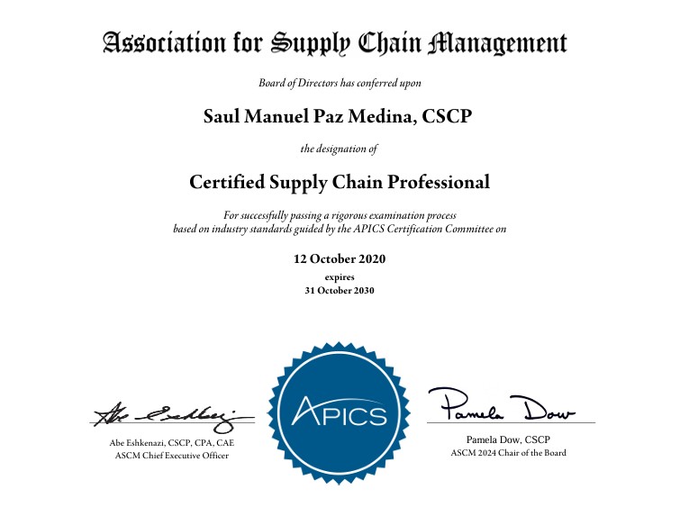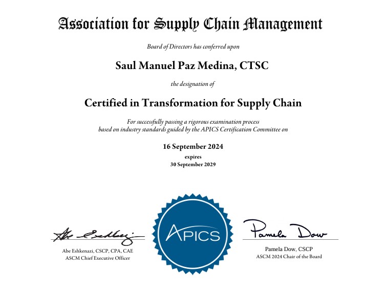 - Certificaciones internacionales: CSCP, CPIM, CLTD, CTSC